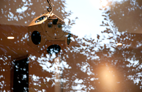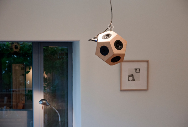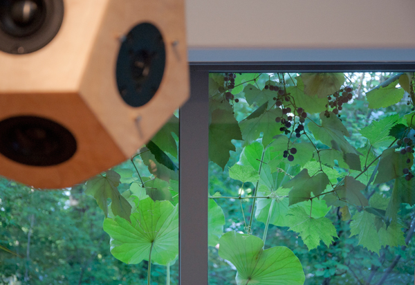森の空気を十分に取り込んだレストラン・なず菜に12面体スピーカー”scenery”とサブウーハー2台を設置。