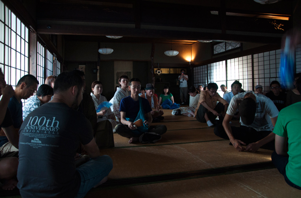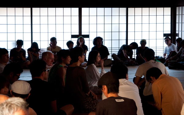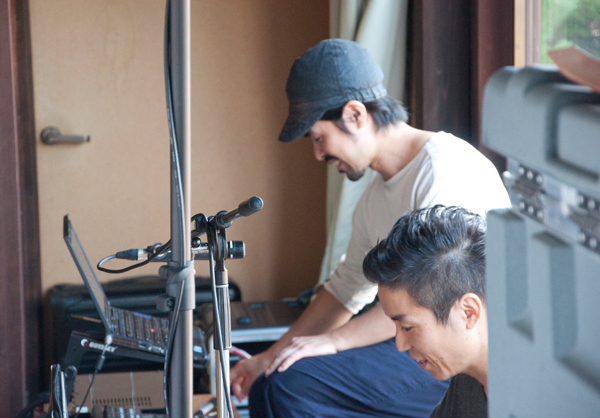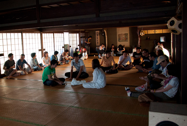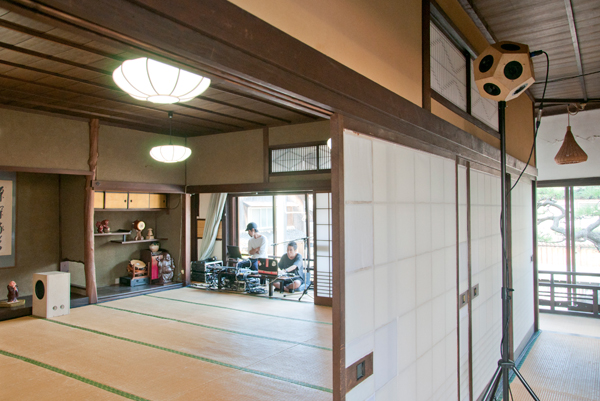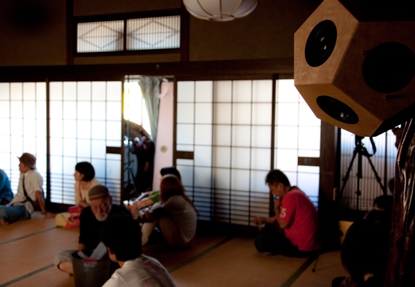 障子を閉めた状態でevalaさんの音源を流し、全員で移動しながら音の響きをチェックします。