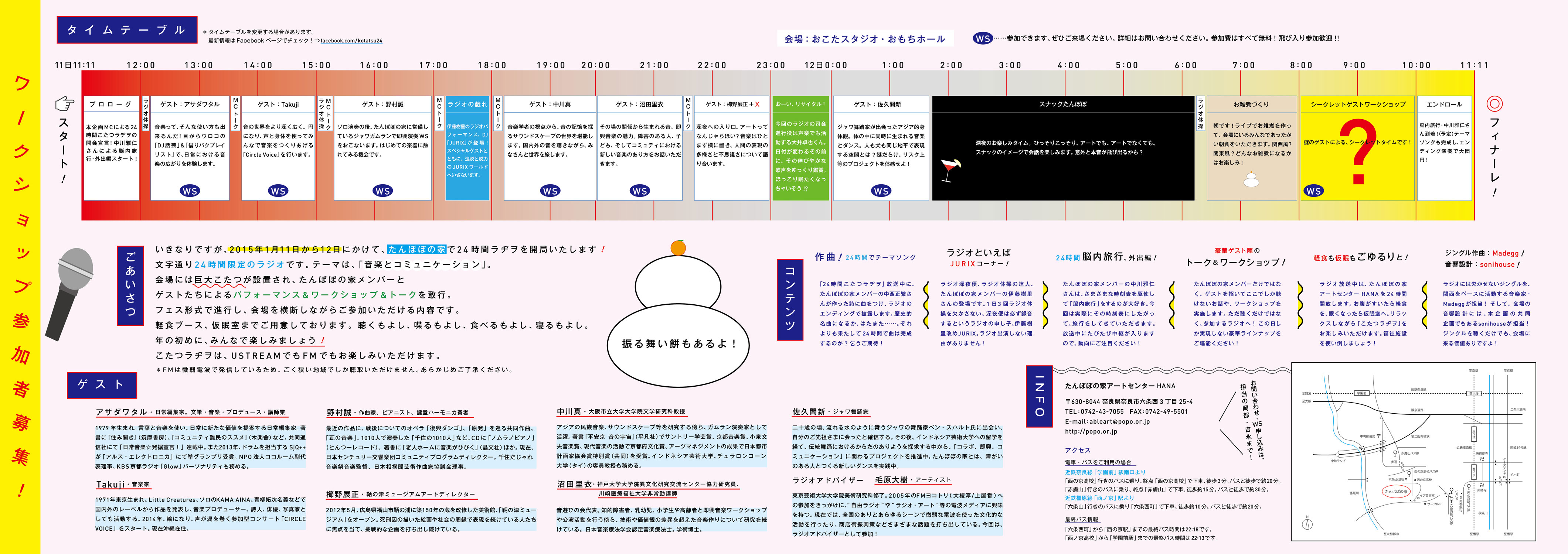 いきなりですが、2015年1月11日から12日にかけて、たんぽぽの家で24時間ラヂヲを開局いたします!文字通り24時間限定のラジオです。テーマは、「音楽とコミュニケーション」。会場には巨大こたつが設置され、ゲストたちによるパフォーマンス&ワークショップ&トークを敢行。フェス形式で進行し、会場を横断しながらご参加いただける内容です。軽食ブース、仮眠室までご用意しております。聴くもよし、喋るもよし、食べるもよし、寝るもよし。年の初めに、みんなで楽しみましょう!