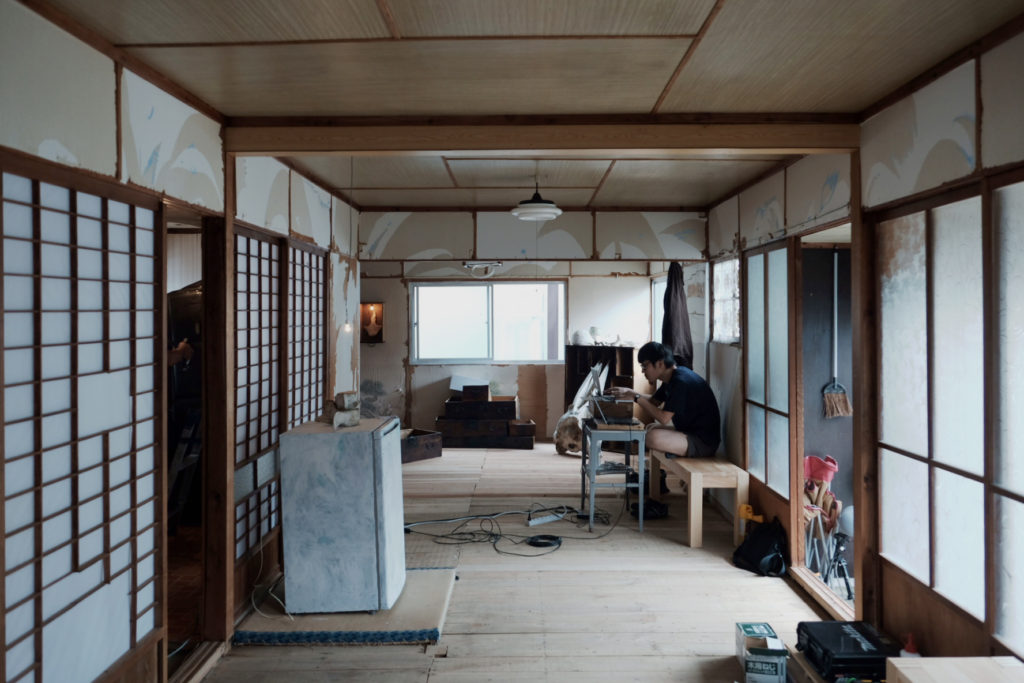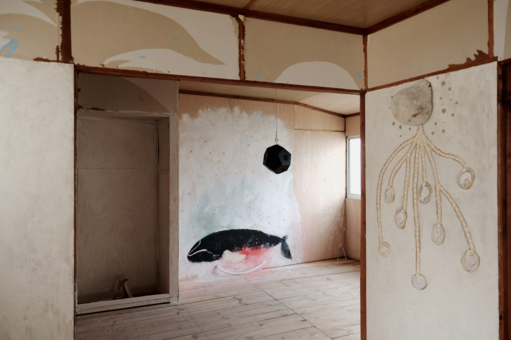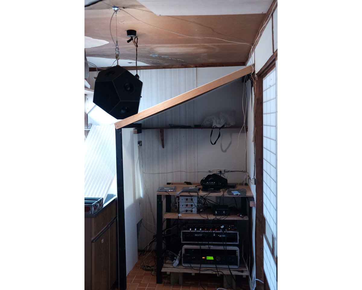 部屋に入って音の発生源として見えるのは12面体スピーカー一台だけですが、近づくとごく小音量で鳴っているだけです。実は他の2ヵ所に振動スピーカーを仕込んでいます。入って正面の障子の向こうからも鳴っていることに気付くかもしれません。これはもう一台の12面体スピーカーです。しかし入って右の部屋は音の発生源になるものが何もないのにしっかりと鳴っているように聴こえます。ここには3ヵ所に振動スピーカーを仕込んでいます。そしてベンチに腰掛けると足元から振動を感じることができます。床下に2台のサブ・ウーハーを仕込んで波音や心臓の鼓動など様々な音を生々しく体験できるようになっています。市子さんが自然にそこで歌ったり演奏しているように、そして鮎川地区で東岳志さんが録ったフィールドレコーディングの音源が自然と部屋に馴染むように作り込んでいます。それらが外からの環境音と交じり合い、どこまでが音源でどこまでが環境音かの境界線をなくすようにしました。(外からの音と言えば12時,17時に聴こえてくる時報の音楽は市子さんが歌っています。)鮎川の豊かな自然のおかげで様々な生き物の声が聴こえてくると思います。朝10時の開始から16時(※土日は17時)の終わりまで物語が紡がれるように音が構成され、そこにランダムに市子さんの歌や演奏、環境音が入ってきます。同じ音の組み合わせはなく、いつでも、いつまでも気持ちよく音を楽しむことができると思います。振動スピーカーを仕込んで実験的なことをしていますが目指すのはいつもの音響の仕事と同じように自然で気持ちの良い音作りでした。
