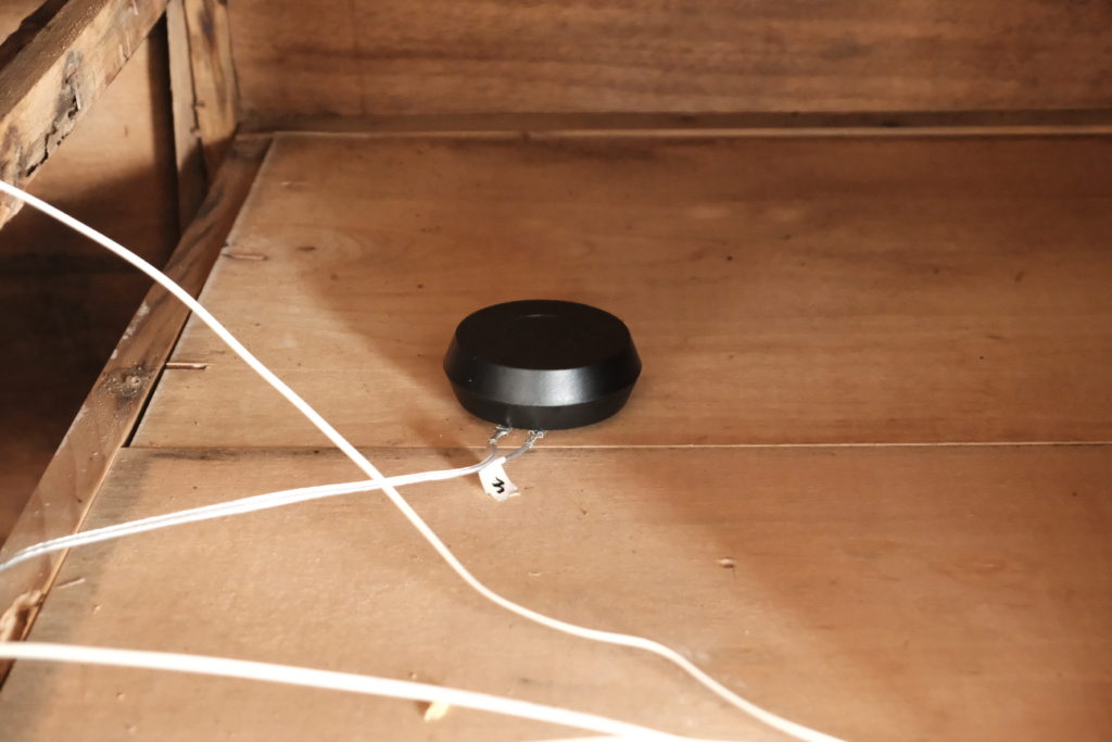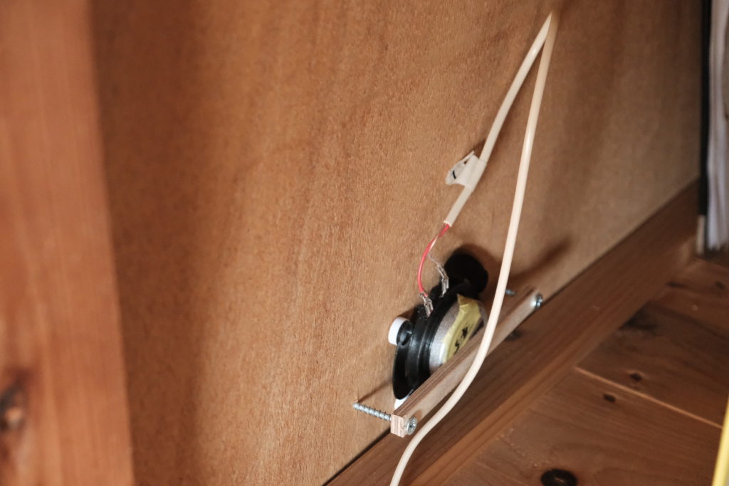 押入内に設置した振動スピーカー。これは防水仕様でねじ込み式。安定して音が結構良かった。