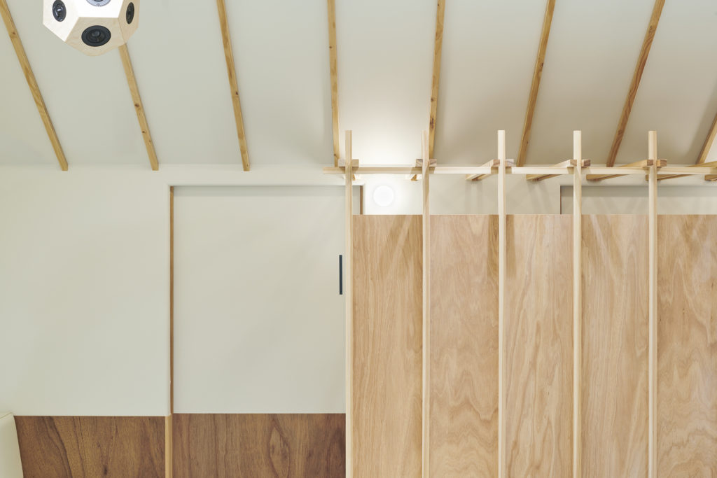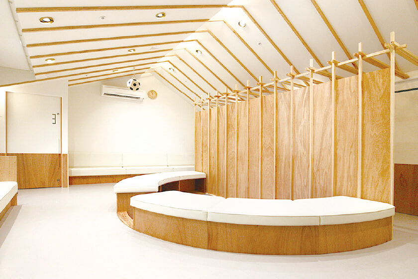 勾配天井で抑揚のある空間と杉材で組まれたパーテーションが、反射と吸音のよいバランスを作り出し、音が自然に広がります。