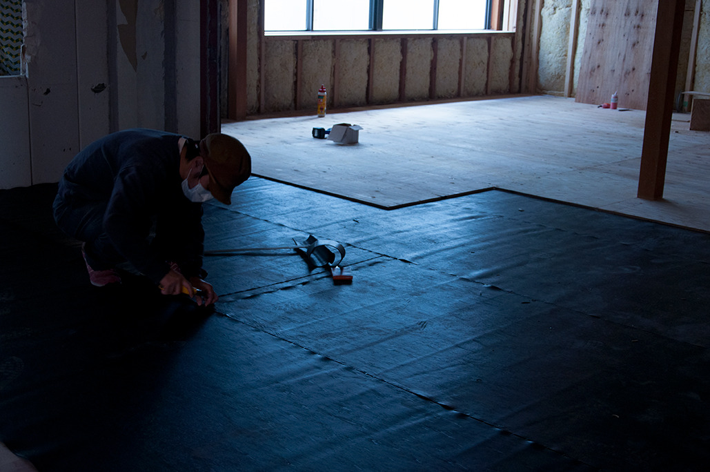 15/10/09 【床面への捨て貼り】 2Fの吸音材も詰め終え、本日はグラグラだった床への捨て貼り作業。床といえど壁と同じく振動を抑制しないと低音が吸われたり、反って不要な響きが足されたりと音への影響...